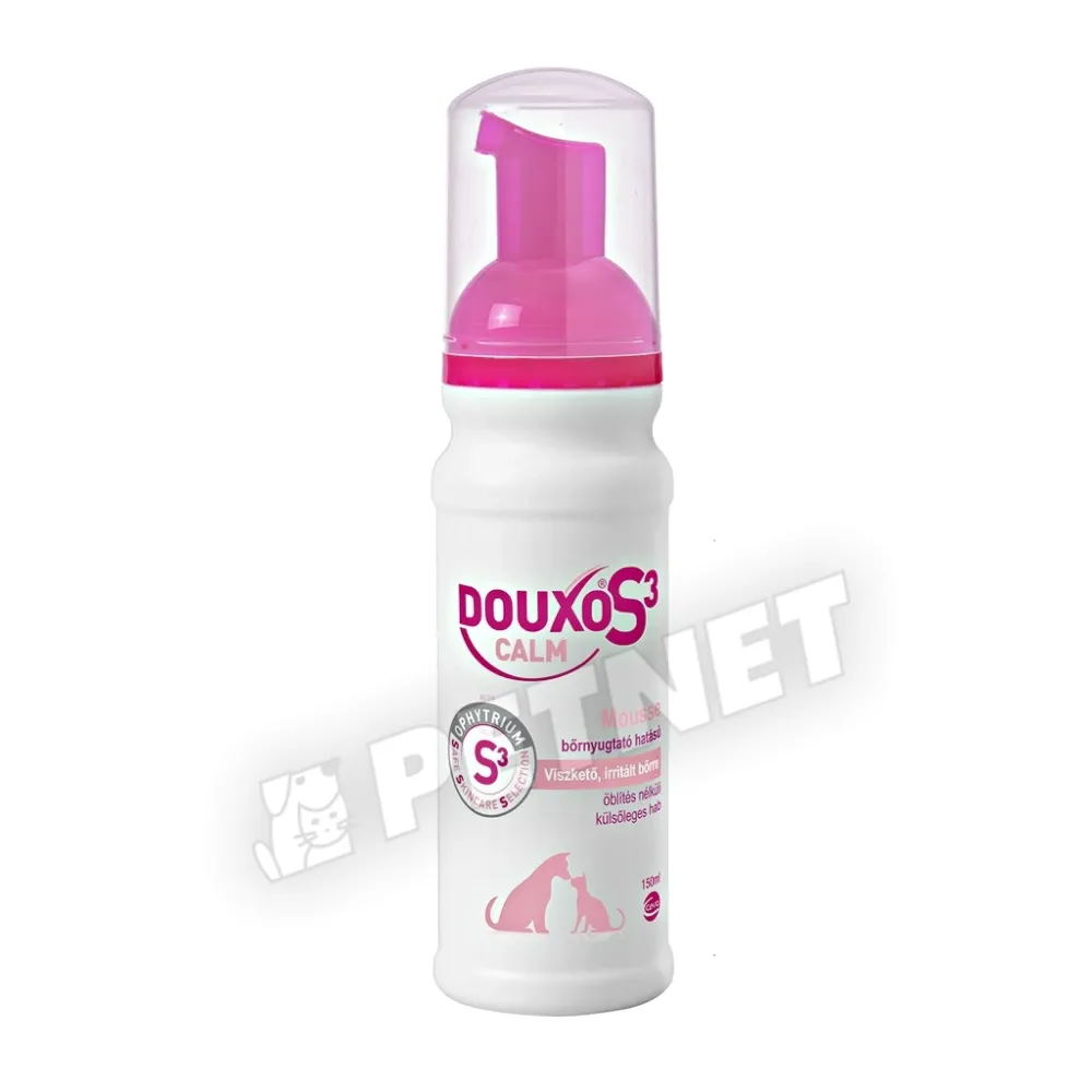 • A Douxo® S3 Calm Hab a kutyák és macskák érzékeny, viszkető vagy irritált bőrének kiegészítő kezelésére javasolt termék. Nyugtatja, és védi a bőrt, elősegíti a normál mikrobiális bőrflóra megtartását. Hidratáló, restrukturáló, kifésülést könnyítő hab, mely puhává és fényessé teszi a szőrzetet.