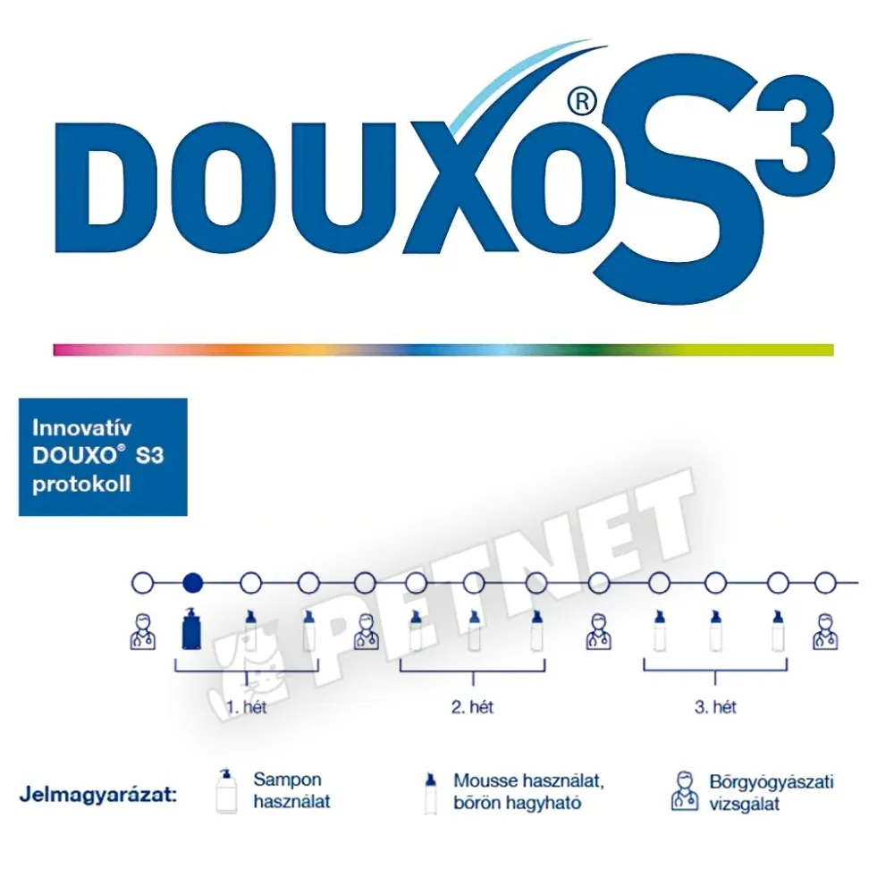 • A Douxo® S3 Pyo Sampon egy tisztító sampon kutyák és macskák számára, mely a 3%-os klórhexidin-diglükonátnak köszönhetően a bőr bakteriális és gombás felülfertőzéseinek kiegészítő kezelésére alkalmazható a bőr mikroflóra egyensúlyának felborulása esetén. Tisztító hatása mellett hidratáló hatású és segít fenntartani a bőr mikroflórájának egyensúlyát (a bőr ökoszisztémáját). Restrukturáló, kifésülést könnyítő sampon, puhává és fényessé teszi a szőrzetet.