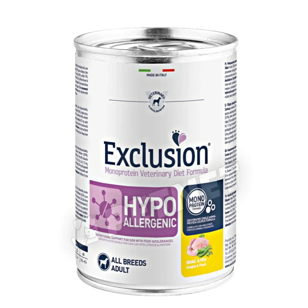 Exclusion Hypoallergenic Quail & Pea – Teljes értékű diétás eledel, melyet kifejezetten a tápanyag-intoleranciával küzdő felnőtt kutyák számára fejlesztettek ki. Fő célja az összetevőkkel és tápanyagokkal szembeni intolerancia tüneteinek csökkentése.