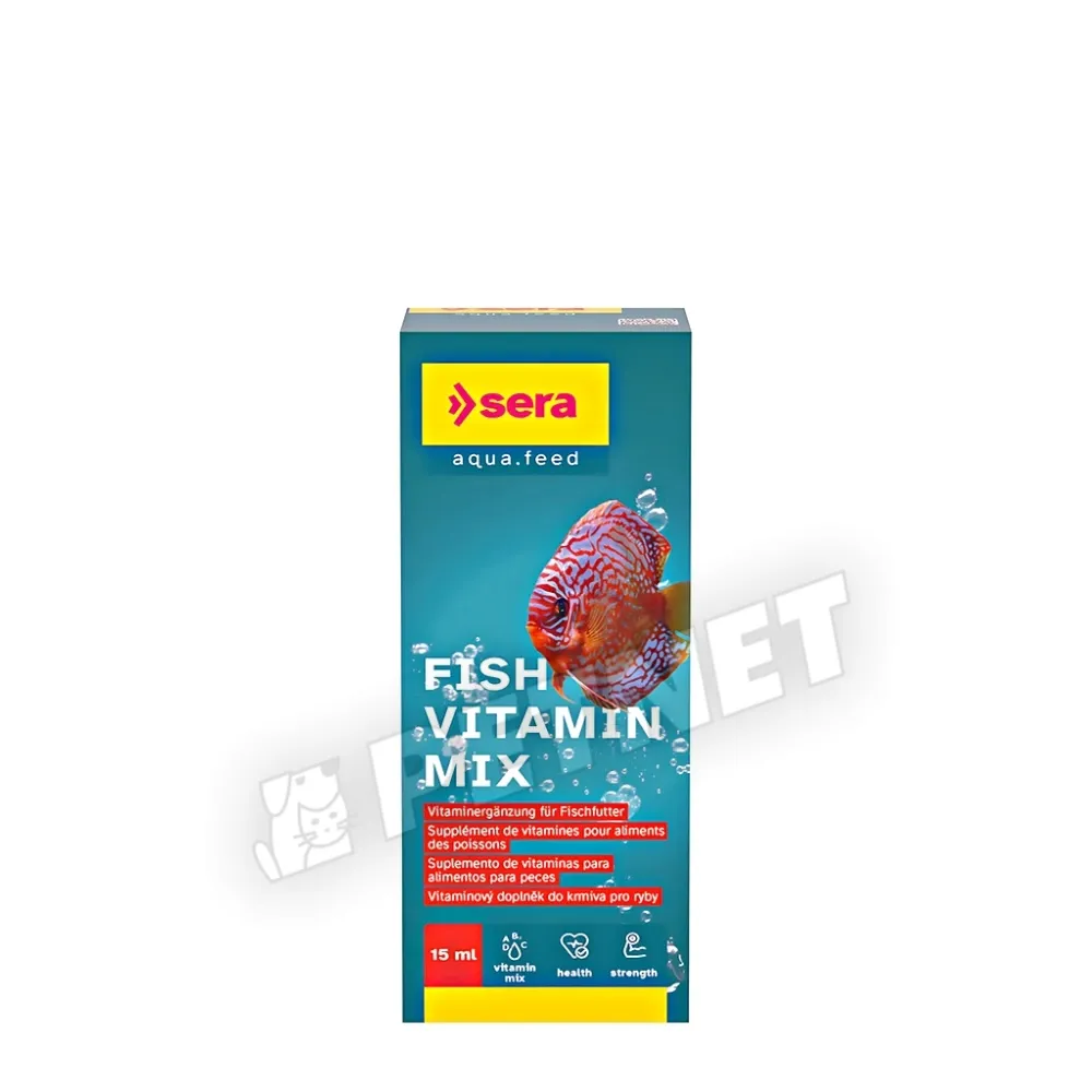 Sera Fish Vitamin Mix – Emulgeáló multivitamin preparátum a halak erősítésére betegség idején ill. után, új akváriumba való behelyezés után, a növendékhalak nevelésére és a táplálék vitaminozására. Közvetlenül az akváriumvízbe adható. Jobb azonban hetente egyszer az etetés előtt halanként 6-7 cseppet közvetlenül a táplálékra csepegtetni.