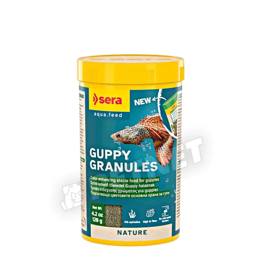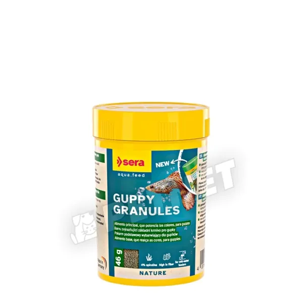 Sera Guppy Granules – Növényi összetevőkben gazdag, teljes értékű alapeleség. A finom szemcsézettségű granulátum lassan süllyed le a vízben, így az akvárium minden szintjén tartózkodó halak számára könnyen elérhetővé válik, de különösen ideális a felszín közelében táplálkozó guppik számára.