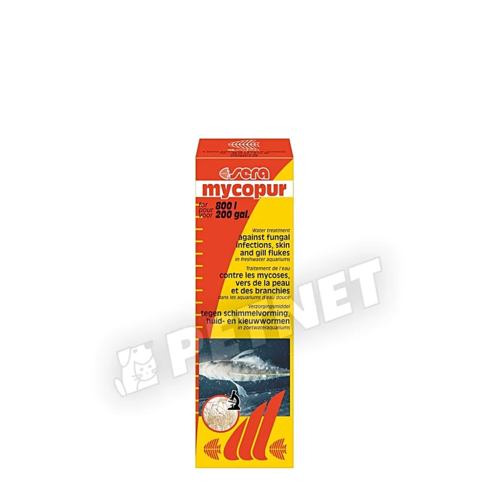 Sera Mycopur - A Sera Mycopur gombák (Saprolegnia), kopoltyúgombásodás, valamint bőr-és uszonyférgek elleni, édesvízi akváriumokban használatos készítmény. Sera Ectopur egyidejű adása megnöveli a hatást.