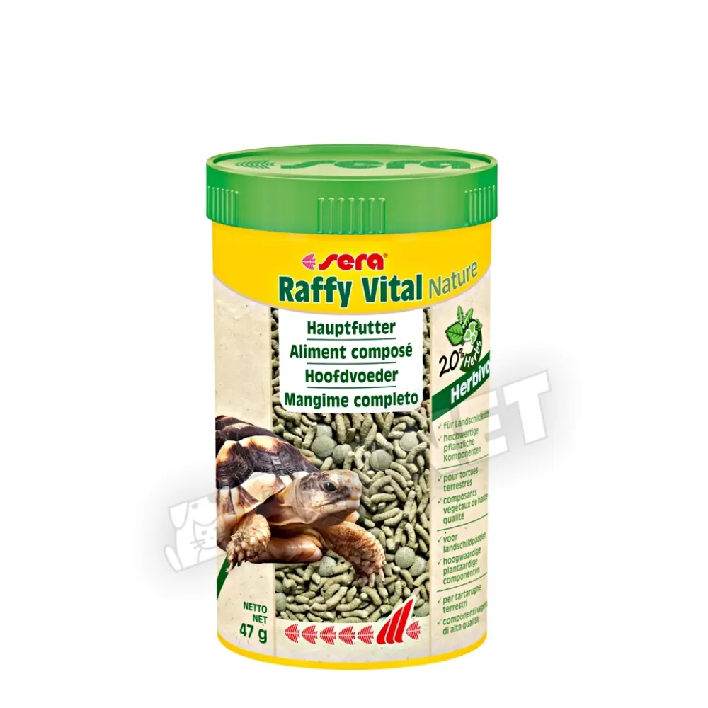 Sera Raffy Vital - Növényi táplálék szárazföldi teknősök és növényevő hüllők számára. A sera raffy Vital finom és ballasztanyagban gazdag keverék gyógynövény pelletekből és tápláléktablettákból, amelyeket valamennyi növényevő hüllő szívesen elfogyaszt.