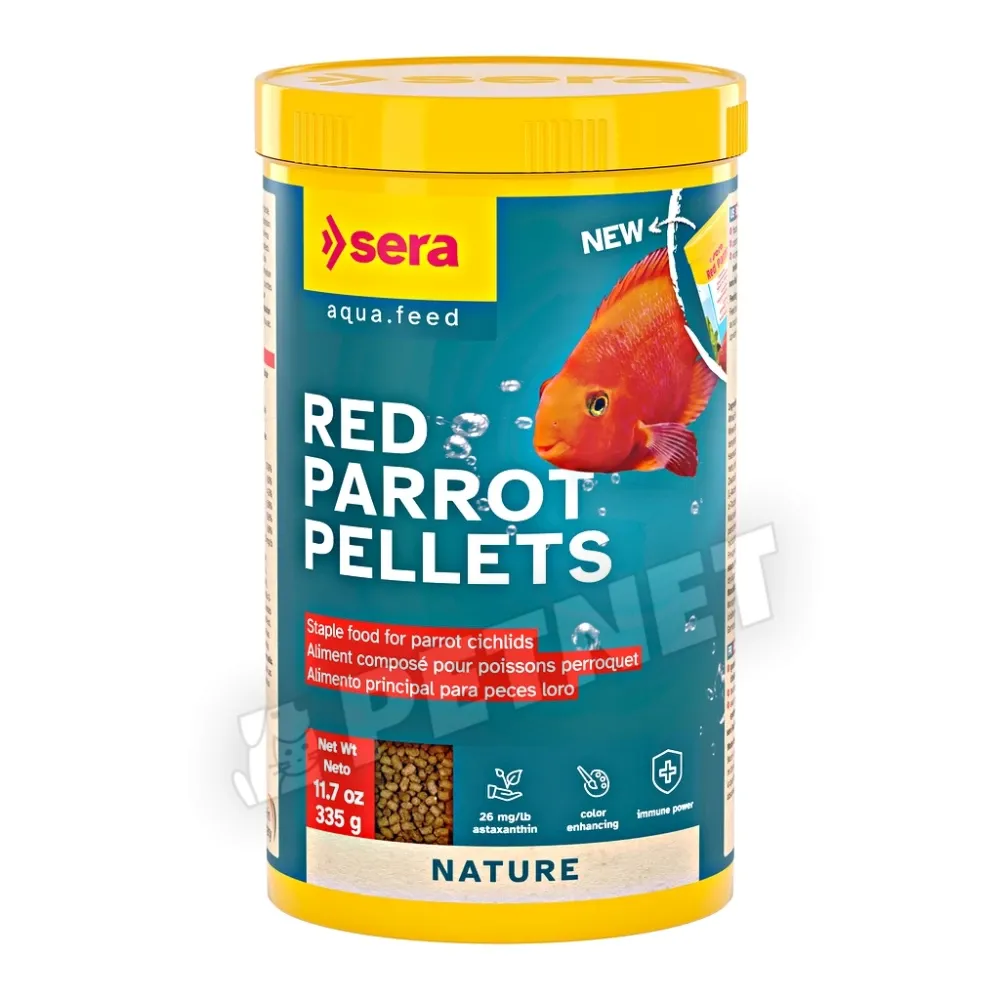 Sera Red Parrot Pellet díszhaleleség – A Sera Red Parrot egy kifejezetten színélénkítő, vízen lebegő granulátumtáplálék, speciálisan papagájsügerek számára kifejlesztve.