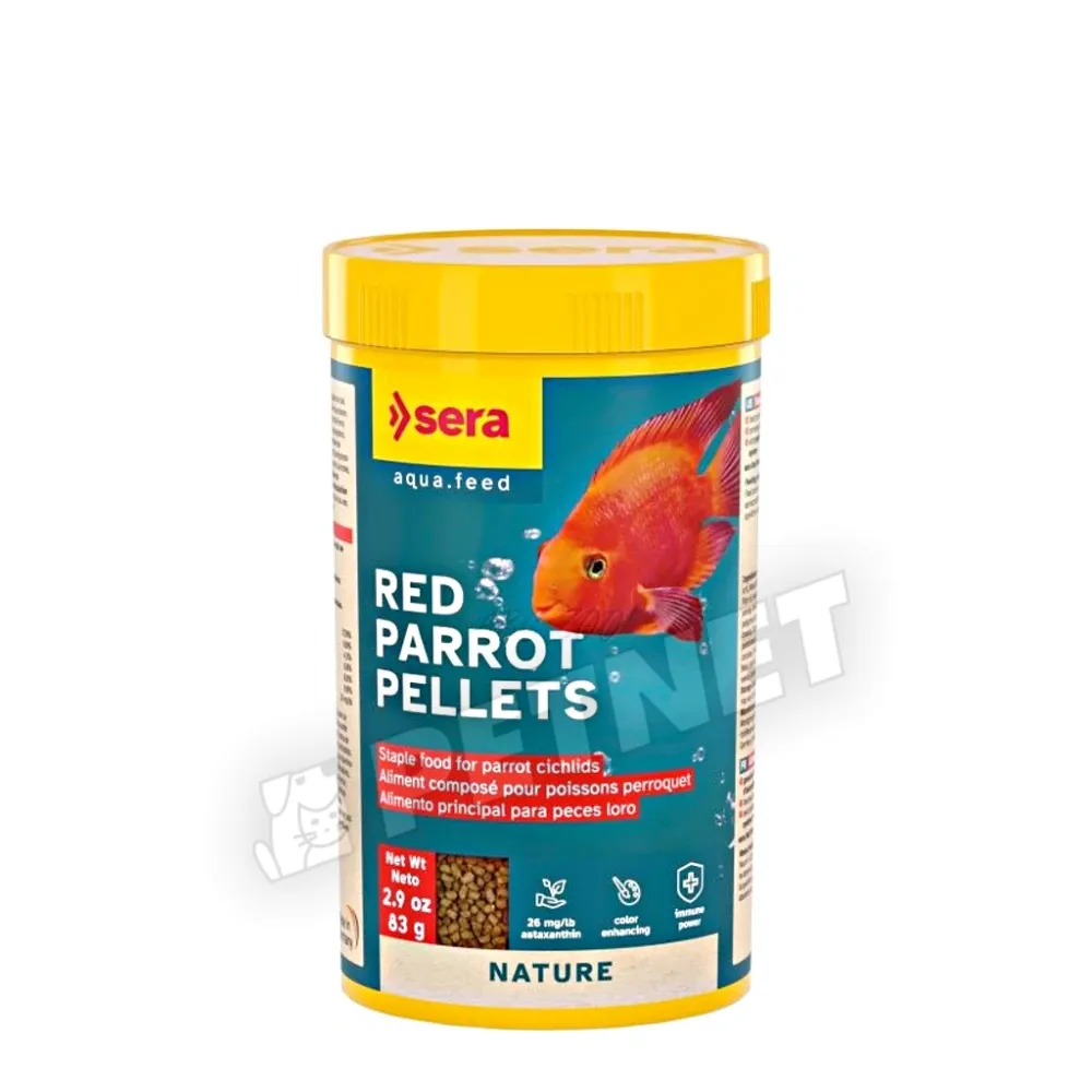 Sera Red Parrot Pellet díszhaleleség – A Sera Red Parrot egy kifejezetten színélénkítő, vízen lebegő granulátumtáplálék, speciálisan papagájsügerek számára kifejlesztve.