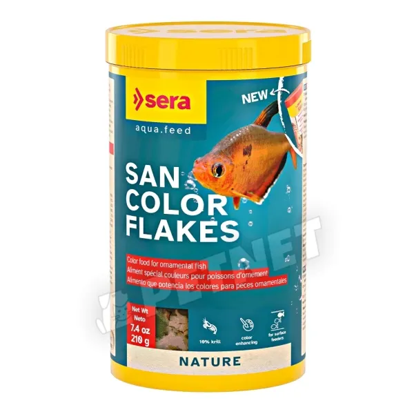 Sera San Color Flakes lemezes díszhaleleség - A Sera San valamennyi díszhal színélínkítését kiválóan megoldja. A Sera San lemezes díszhaleleség hal- és gabonaliszttel, valamint tengeri algákkal és spirulinával dúsított. Sera San az optimális növekedésért és a legjobb nevelési eredményekért.