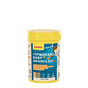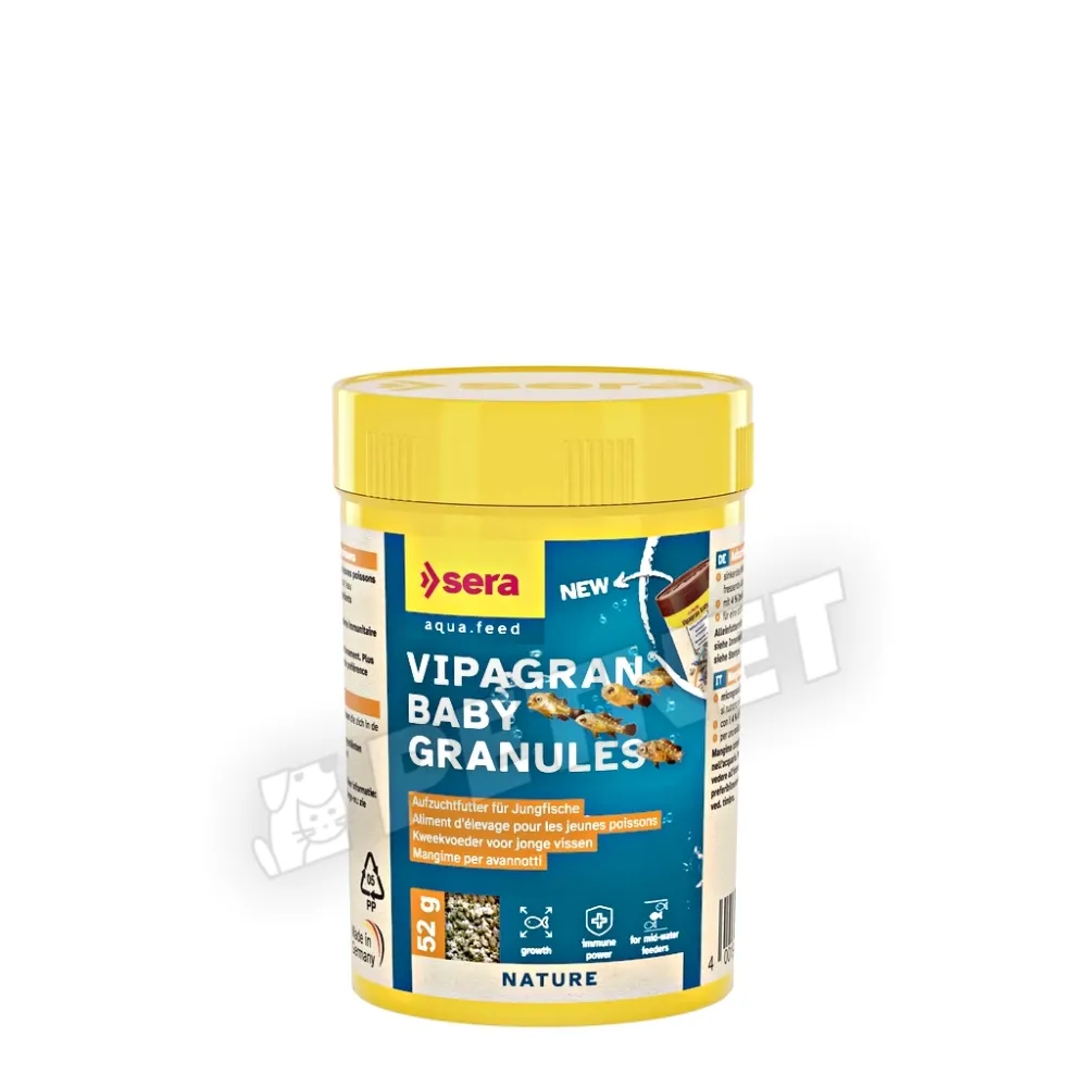 Sera Vipagran Baby szemcsés granulát díszhaleleség - A Sera Vipagran egy teljesen újfajta lágy granulátum gondosan kiválogatott és kíméletesen feldolgozott nyersanyagokból. A Sera Vipagran valamennyi fontos vitamint, ásványi anyagot és esszenciális nyomelemet tartalmazza. A stabilizált C vitamin megnöveli az ellenálló képességet és erősíti az immunrendszert. A lágy konzisztencia és a könnyű fogyaszthatóság a Sera Vipagran-t ideális táplálékká teszi a legnépszerübb halak számára, mint a Fekete Molly, a Platty, Guppy és a Neonhalak.