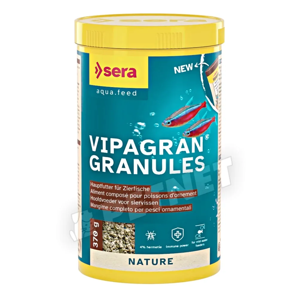 Sera Vipagran Nature granulát díszhaleleség – A Sera Vipagran egy teljesen újfajta lágy granulátum gondosan kiválogatott és kíméletesen feldolgozott nyersanyagokból, a legnépszerübb halak számára, mint a Fekete Molly, a Platty, Guppy és a Neonhalak.