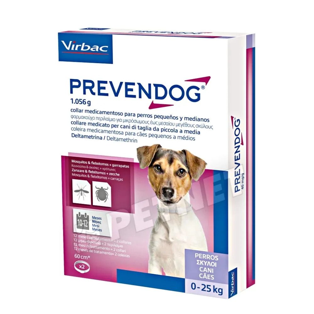 Virbac Prevendog szúnyog és kullancs elleni nyakörv – 4% deltametrinnel impregnált lágy, szagmentes nyakörv, bizonyított hatóanyaggal. Víztaszító, ellenáll a vízbe merülésnek. Kontakt alapon működik, szisztémás hatás nélkül, gyors és hosszantartó védelmet biztosít: 6 hónap kullancs és szúnyog ellen, 5 hónap védelem lepkeszúnyogok ellen, továbbá 10-12 hónap repellens hatás a kutyát veszélyeztető főbb parazitákkal szemben.
