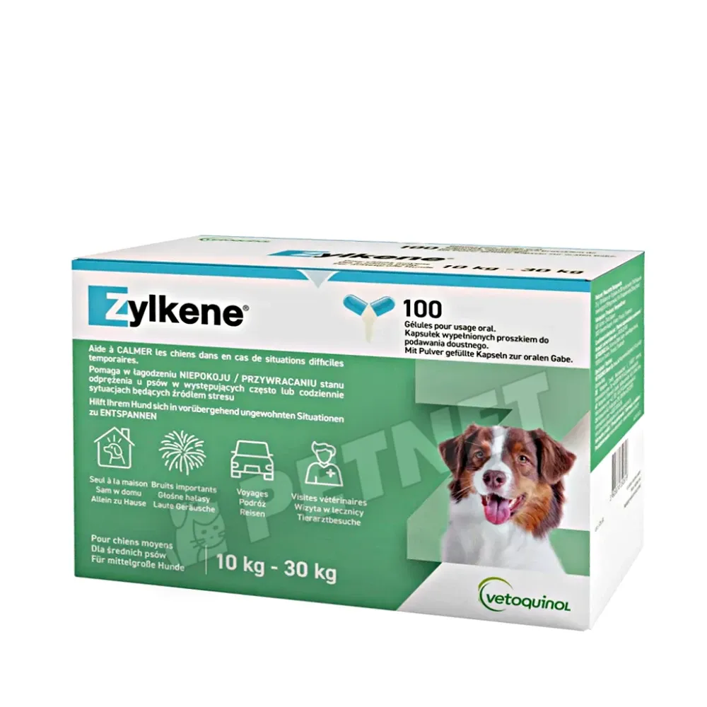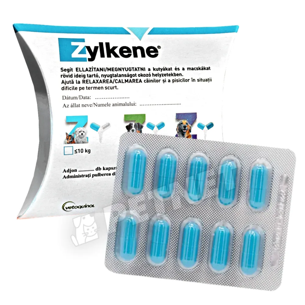 Zylkéne stresszoldó, nyugtató tabletta – A Zylkéne kapszula természetes eredetű megoldásként, hatékonyan segít a macskáknak és kutyáknak túljutni a stresszes állapotokon. A Zylkéne egy olyan vény nélkül kapható készítmény, amelynek hatóanyaga egy bioaktív, tejfehérje eredetű dekapeptid, az alpha-kazeozepin. Zylkene kapszula nem tartalmaz tartósítószert, sem laktózt, így az allergia kialakulásának a veszélye is minimális.