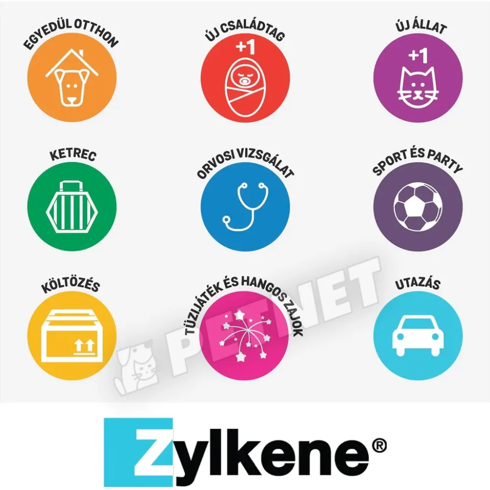 Zylkéne stresszoldó, nyugtató tabletta – A Zylkéne kapszula természetes eredetű megoldásként, hatékonyan segít a macskáknak és kutyáknak túljutni a stresszes állapotokon. A Zylkéne egy olyan vény nélkül kapható készítmény, amelynek hatóanyaga egy bioaktív, tejfehérje eredetű dekapeptid, az alpha-kazeozepin. Zylkene kapszula nem tartalmaz tartósítószert, sem laktózt, így az allergia kialakulásának a veszélye is minimális.